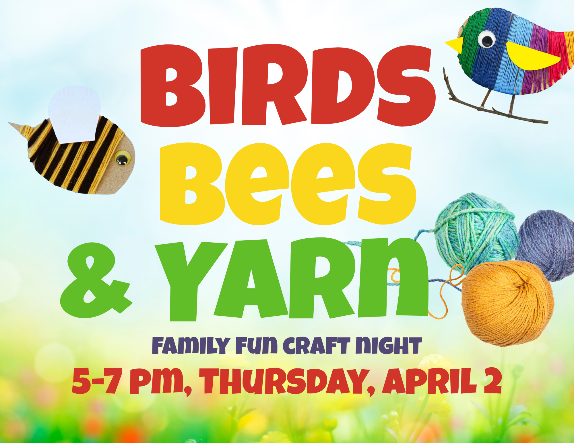 Birds, Bees and Yarn Use cardboard cutouts, yarn and other craft supplies to make a bird or bee. Just in time for spring. + Add to Google Calendar + iCal / Outlook export 00 days 00 hours 00 minutes 00 seconds Date Apr 02 2026 Time 5:00 pm - 7:00 pm Category Families Share this event